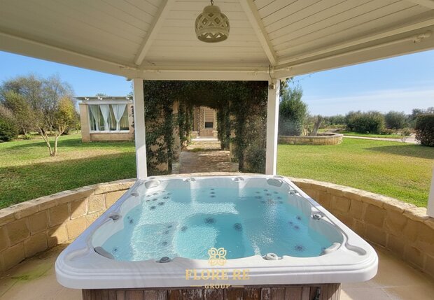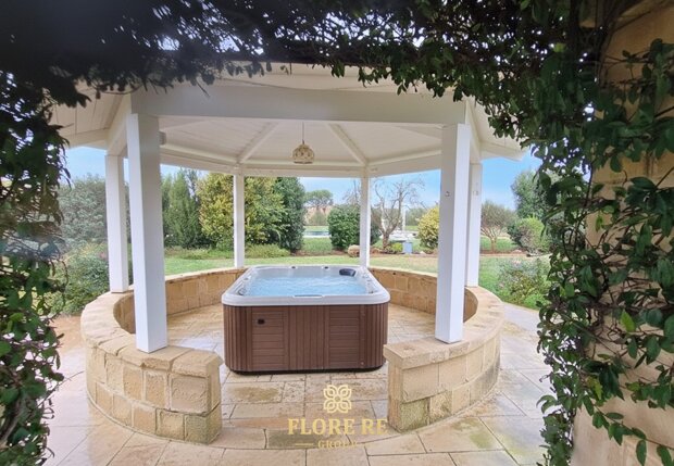 Area Benessere : Un gazebo dedicato ospita una moderna vasca idromassaggio jacuzzi , creando un angolo di paradiso per il relax totale.