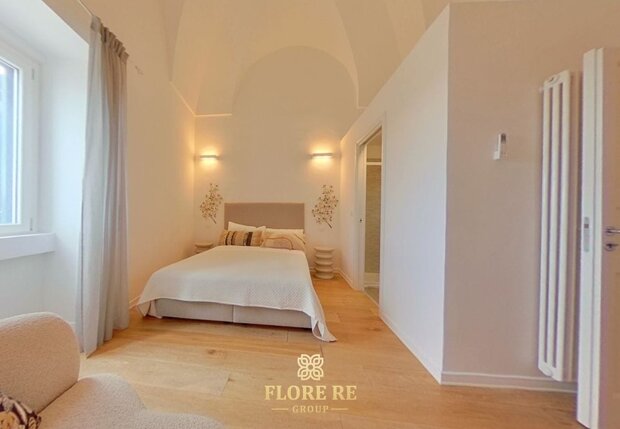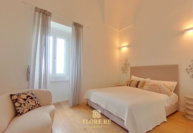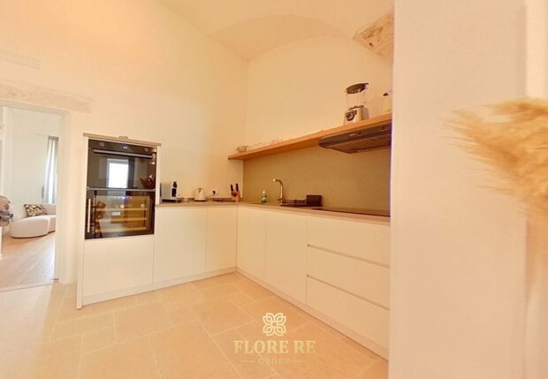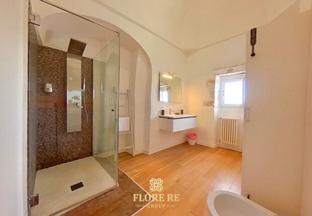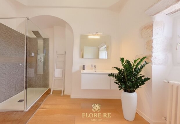 Dettagli di Prestigio e Comfort Moderno Ogni ambiente è curato con meticolosa attenzione, esaltando elementi che richiamano la ricca tradizione pugliese, come le nicchie in pietra e le travi a vista. Il bagno, dal design moderno e funzionale, testimonianza dell'attenzione per un'estetica raffinata e un comfort senza compromessi.