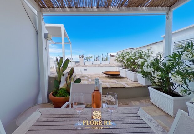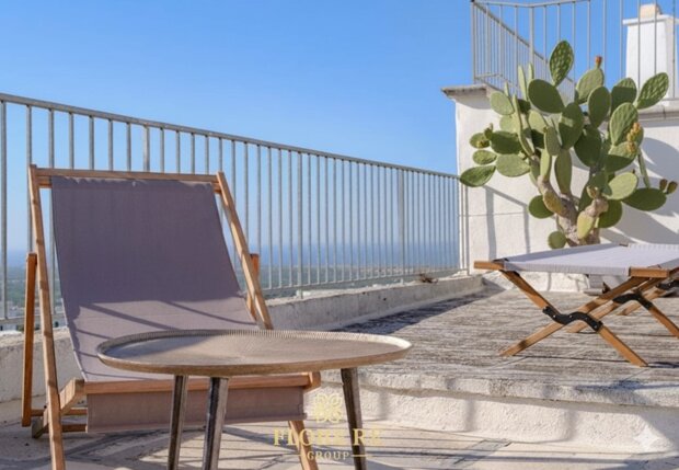 Terrazzo Esclusivo con Zona Pranzo e Relax: Eleganza Mediterranea. Salendo sul terrazzo principale, si apre un mondo di raffinatezza e tranquillità. Qui, il cielo terso si fonde con la fresca brezza marina, accarezzando le rigogliose piante di oleandro bianco in vasi di ceramica, che aggiungono un tocco di eleganza mediterranea. Il pavimento in pietra chiara, autentico richiamo all'architettura pugliese, ti conduce a una confortevole ed ampia zona pranzo: un ampio tavolo in legno e comode sedie invitano a indimenticabili banchetti all'aperto, dove i sapori della cucina locale si uniscono alla vista impareggiabile del borgo bianco e delle verdi distese di ulivi che si spingono fino al mare.