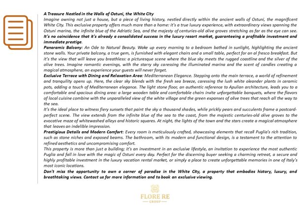 Questa proprietà non è solo un immobile; è un investimento in uno stile di vita esclusivo, un invito a vivere la Puglia più autentica e ad innamorarsi ogni giorno della magia di Ostuni. Perfetto per l'acquirente esigente che cerca un rifugio di charme, un investimento sicuro e altamente redditizio nel mercato delle locazioni turistiche di lusso, o semplicemente un luogo dove creare ricordi indimenticabili in una delle località più iconiche d'Italia.