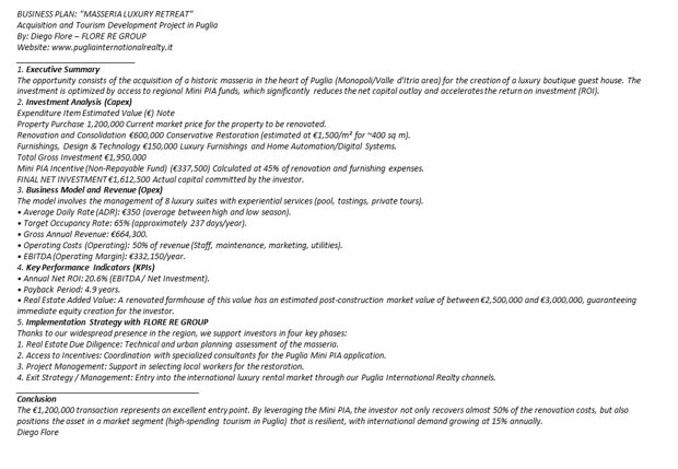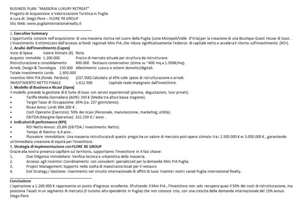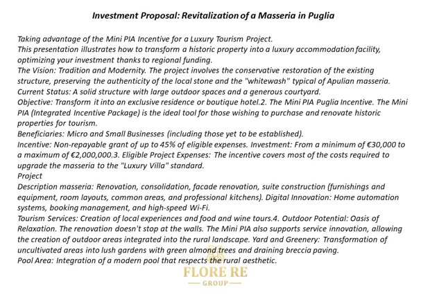 🏨 Il Progetto: Masseria Luxury Retreat Business Plan prevede la creazione di una Boutique Guest House d'élite composta da:18 Suite di Lusso: Design che fonde l'autenticità della pietra locale con i più moderni sistemi di domotica. 2 Oasi di Relax: Piscina moderna integrata nel paesaggio rurale e giardini rigogliosi.