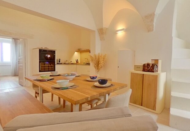 Interni d'Autore : gli ambienti sono impreziositi da spettacolari volte a botte in pietra a vista e pavimenti in chianca originale che riflettono la luce naturale.