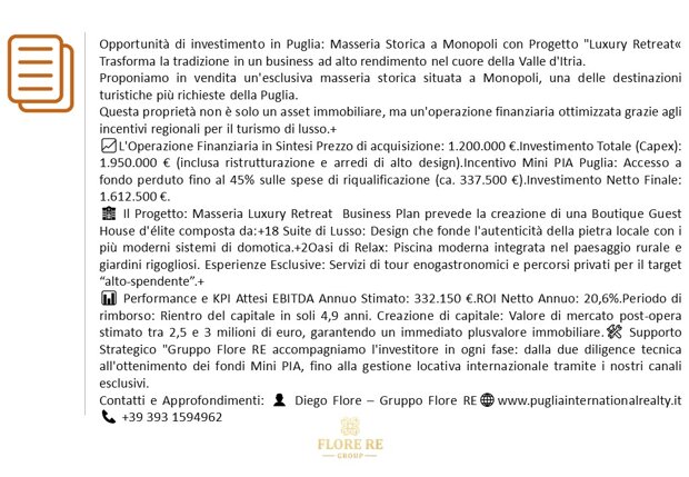 Opportunità di investimento in Puglia: Masseria Storica a Monopoli con Progetto "Luxury Retreat« Trasforma la tradizione in un business ad alto rendimento nel cuore della Valle d'Itria.