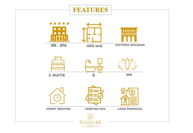 La struttura accoglie gli ospiti in sole tre suite esclusive, progettate per garantire il massimo comfort e privacy. Ogni suite, con le sue maestose volte affrescate, le finiture di pregio e gli arredi eleganti, racconta una storia antica, immergendo gli ospiti in un'atmosfera dal fascino senza tempo.