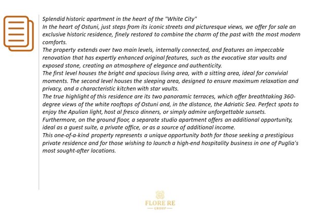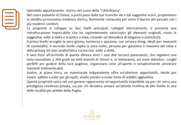 Nel cuore di Ostuni, a pochi passi dalle sue vie iconiche e dai suoi scorci pittoreschi, proponiamo in vendita un'esclusiva dimora storica, finemente ristrutturata per coniugare il fascino del passato con i comfort più moderni.