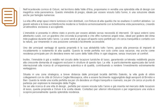 Nell'incantevole cornice di Ostuni, nella Valle d'Itria, proponiamo in vendita una splendida villa di design con magnifica vista panoramica. Questa prestigiosa proprietà, ideale per essere vissuta tutto l'anno, è una soluzione ideale anche per famiglie numerose.